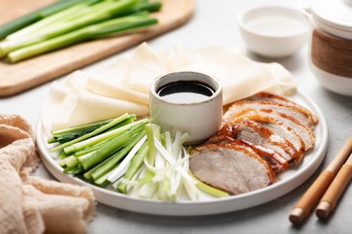 Often served alongside paper-thin pancakes, sliced vegetables, and hoisin or plum sauce, this classic dish takes multiple days to prepare traditionally and allows diners to assemble their own perfect bite.